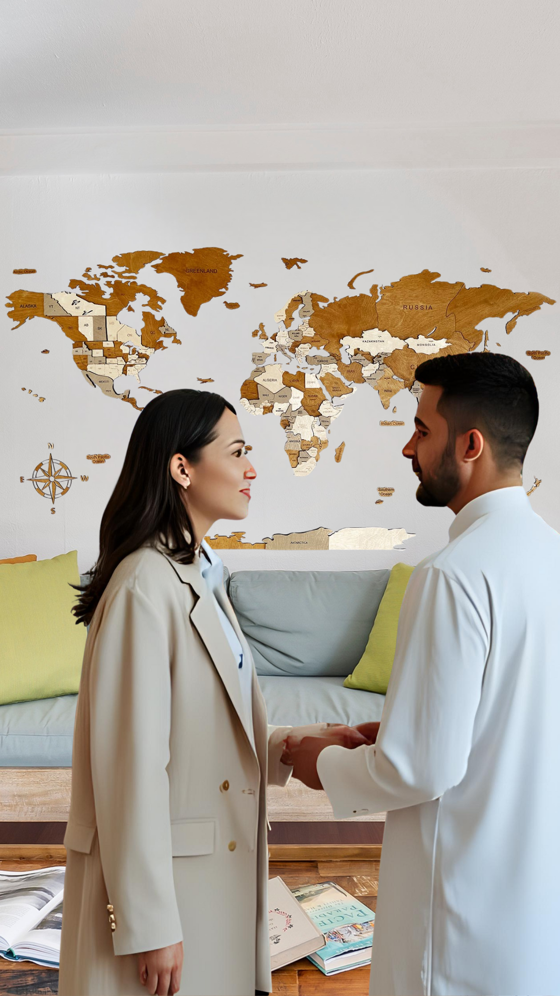 Unsere 3D-Holzweltkarte ist ein einzigartiges Wanddekorationselement, das die Topographie der Erde detailgetreu nachbildet. Jeder Kontinent ist aus präzise lasergeschnittenem und mehrschichtigem Holz gearbeitet, um die Berge und Täler plastisch und haptisch erlebbar zu machen.